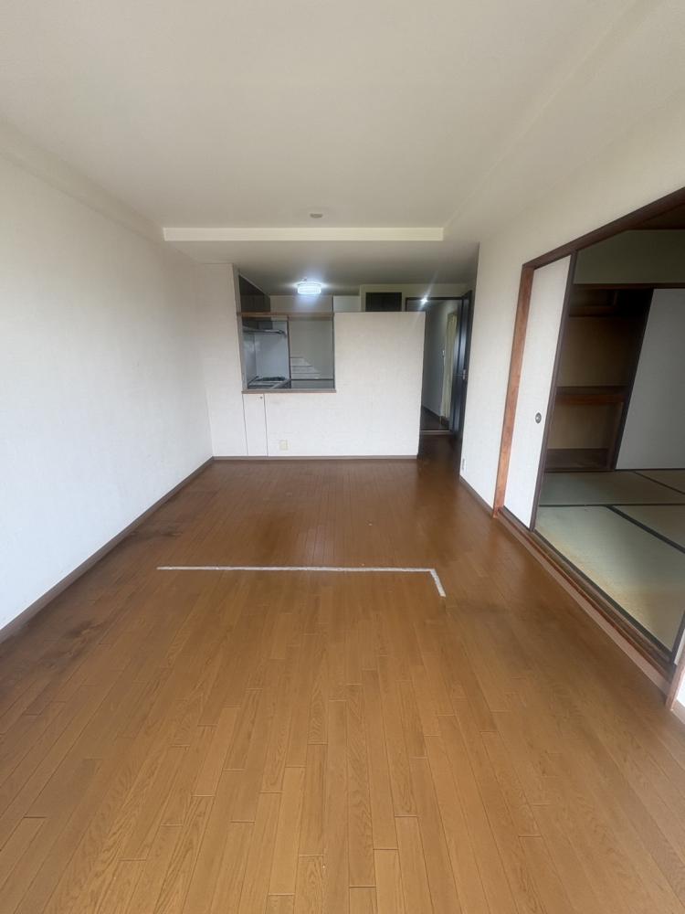 <リビング>キッチンの壁を取り、床、壁紙張替。和室→洋室に変更でフラットに。