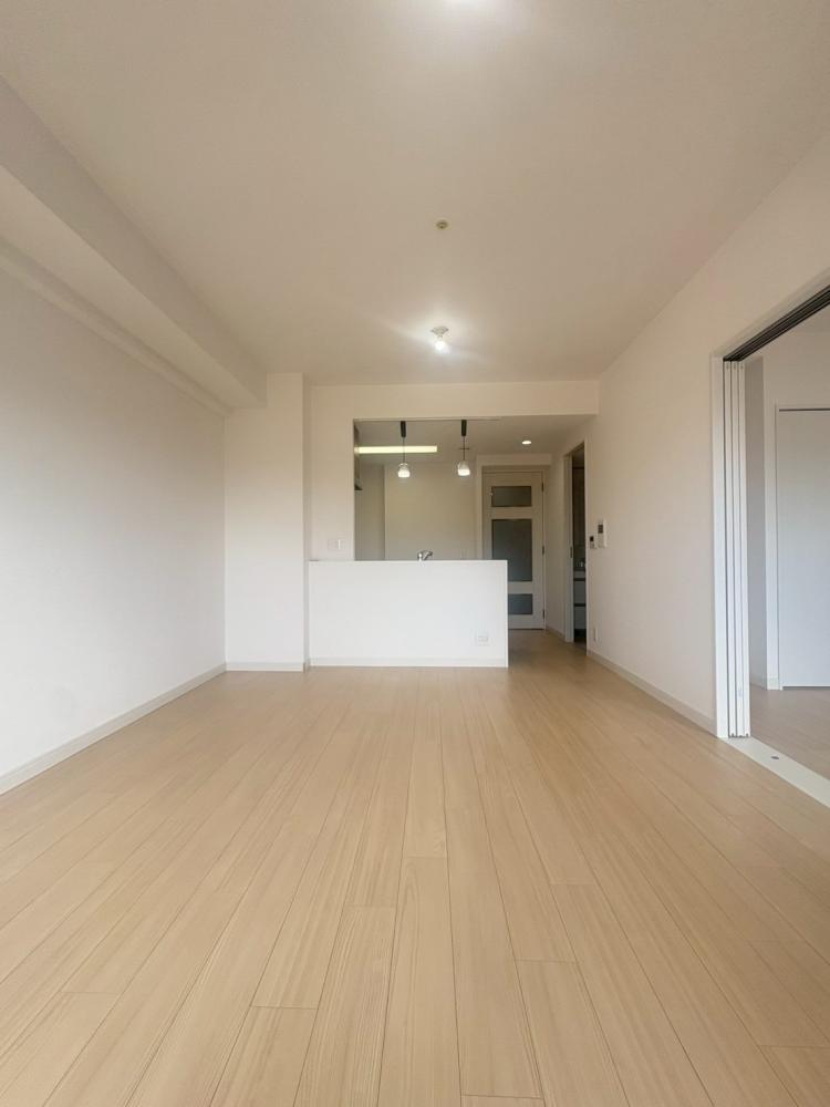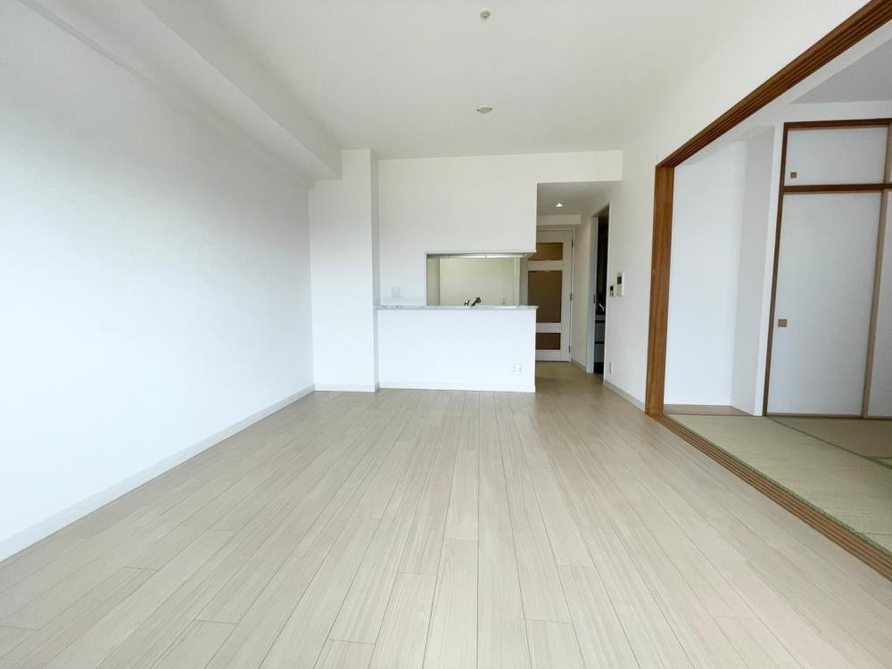 <リビング>キッチンの壁を取り、床、壁紙張替。和室→洋室に変更でフラットに。