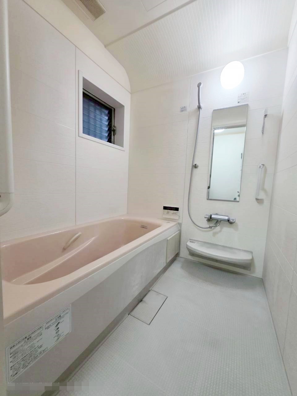 【浴室】明るい色合いのバスルーム。ゆったりと浸かれる広さがあります。