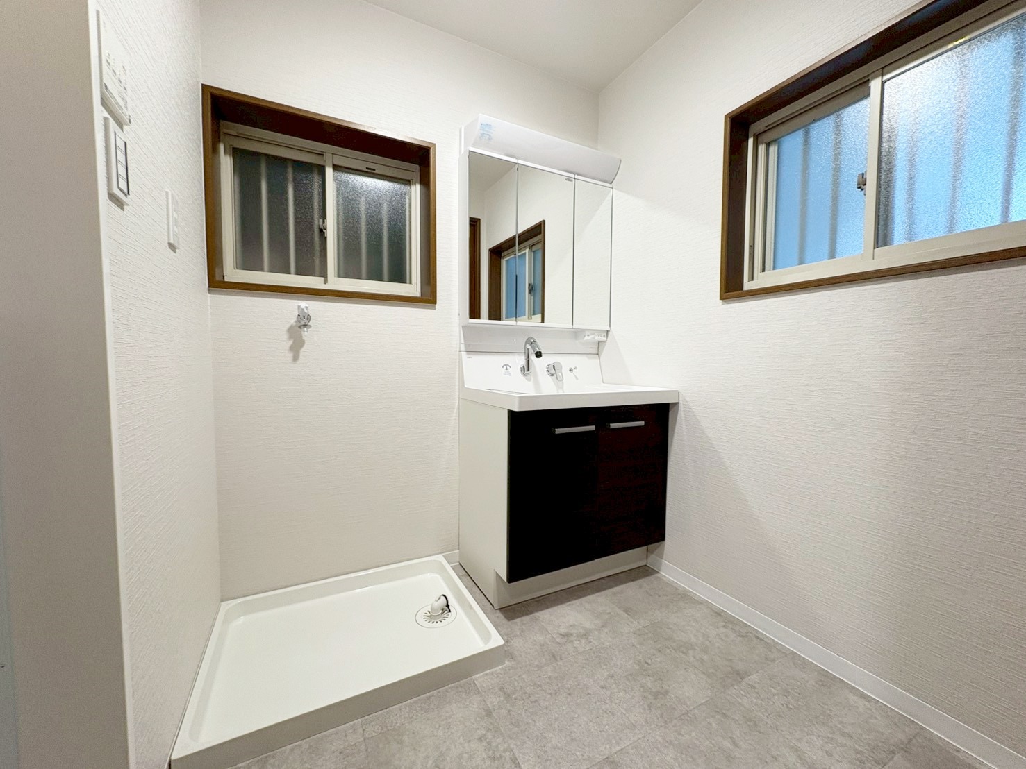 【洗面台・洗面室】リフォーム時に新調済の洗面化粧台、洗濯機置き場。下部に収納スペース付きです。