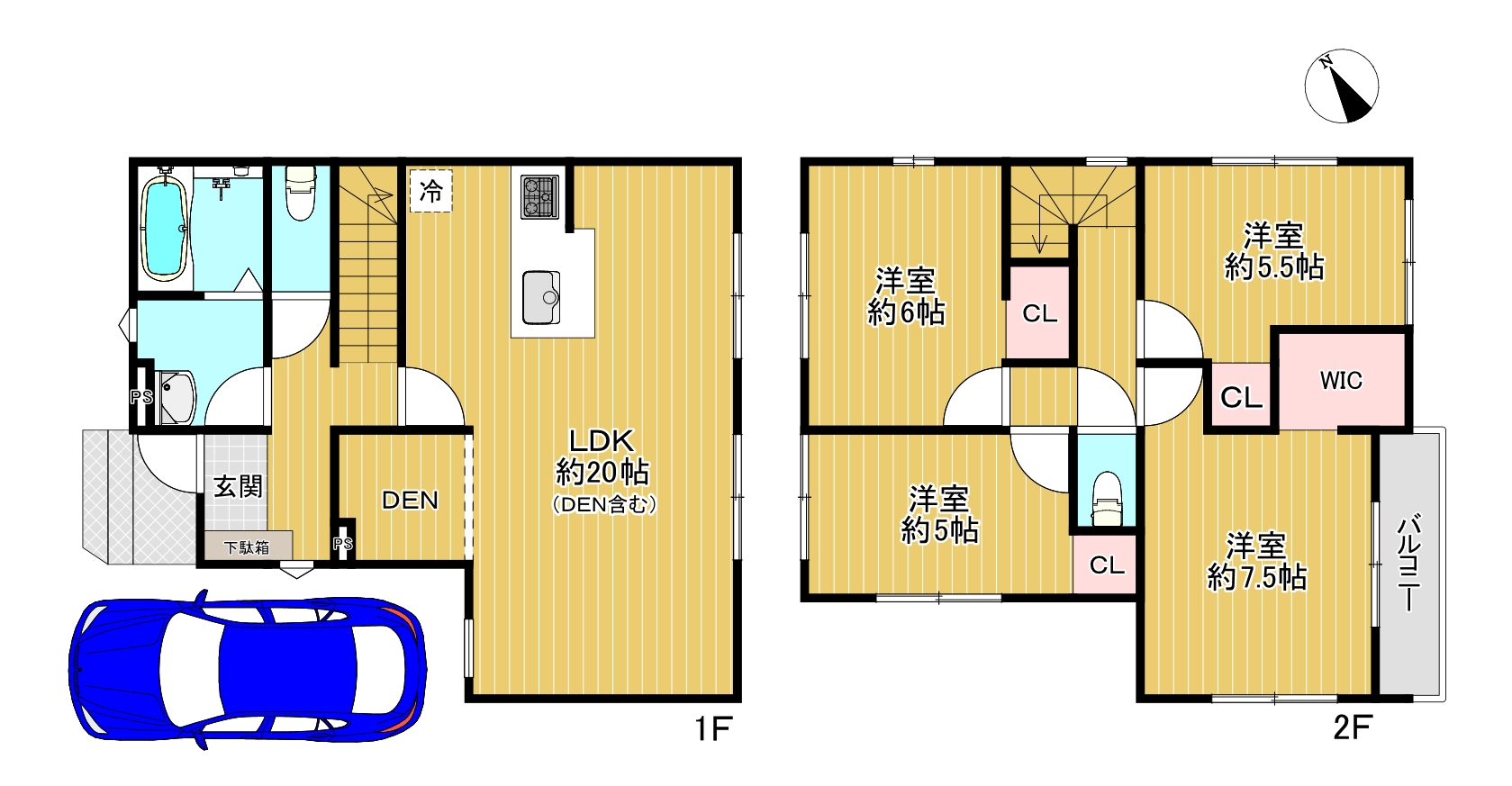 【間取り】書斎付きのリビングは約20帖と広々住空間!