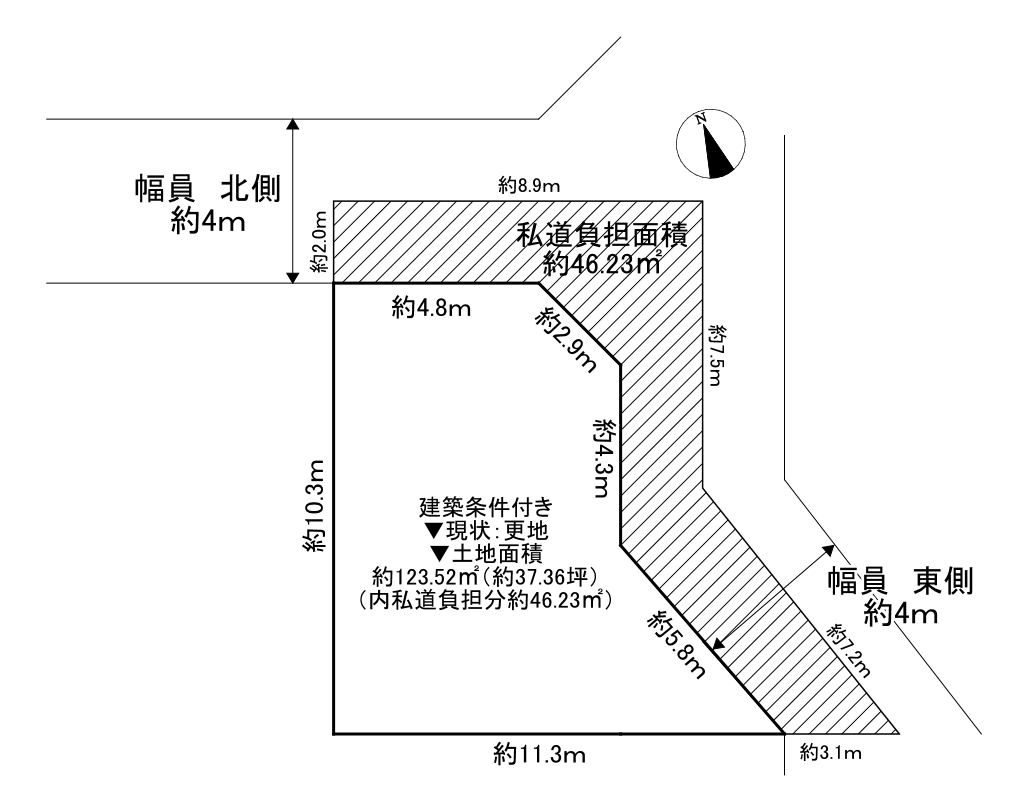 【土地図面】土地面積:約123.52平米(約37.36坪)内私道負担面積約46.23平米