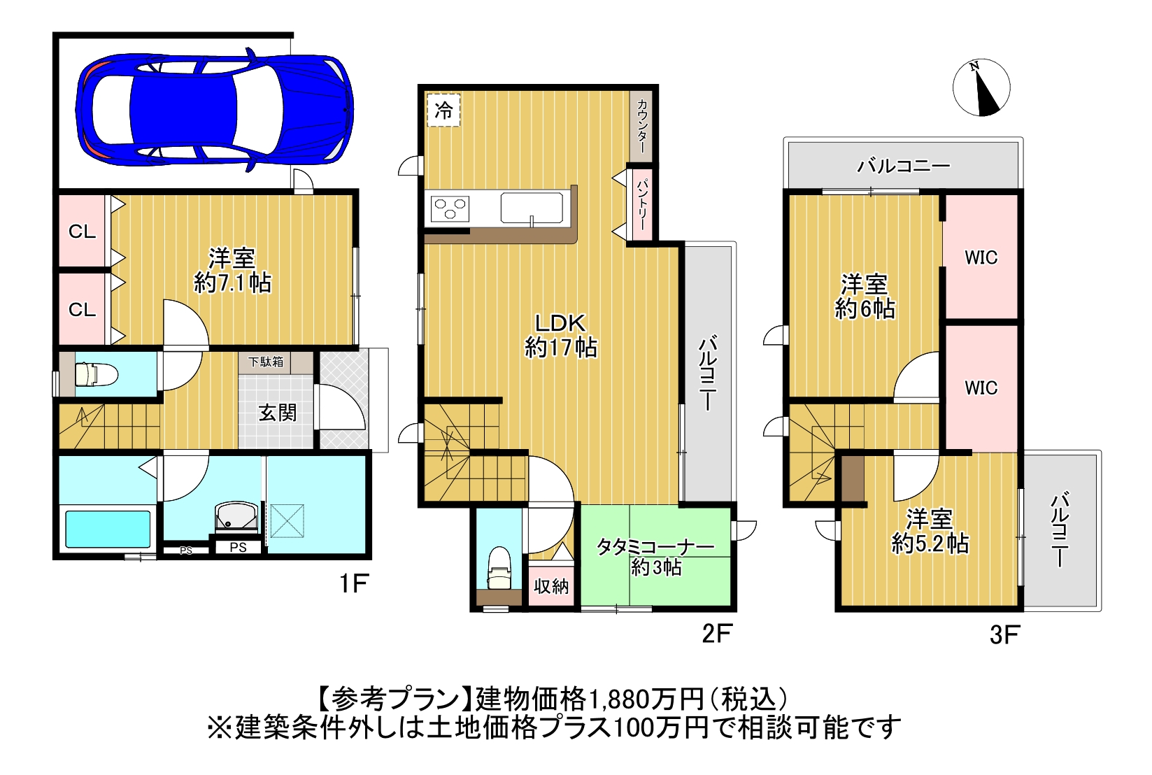 【プラン図】建物面積約111.37平米の3階建て。建物価格1880万円です。