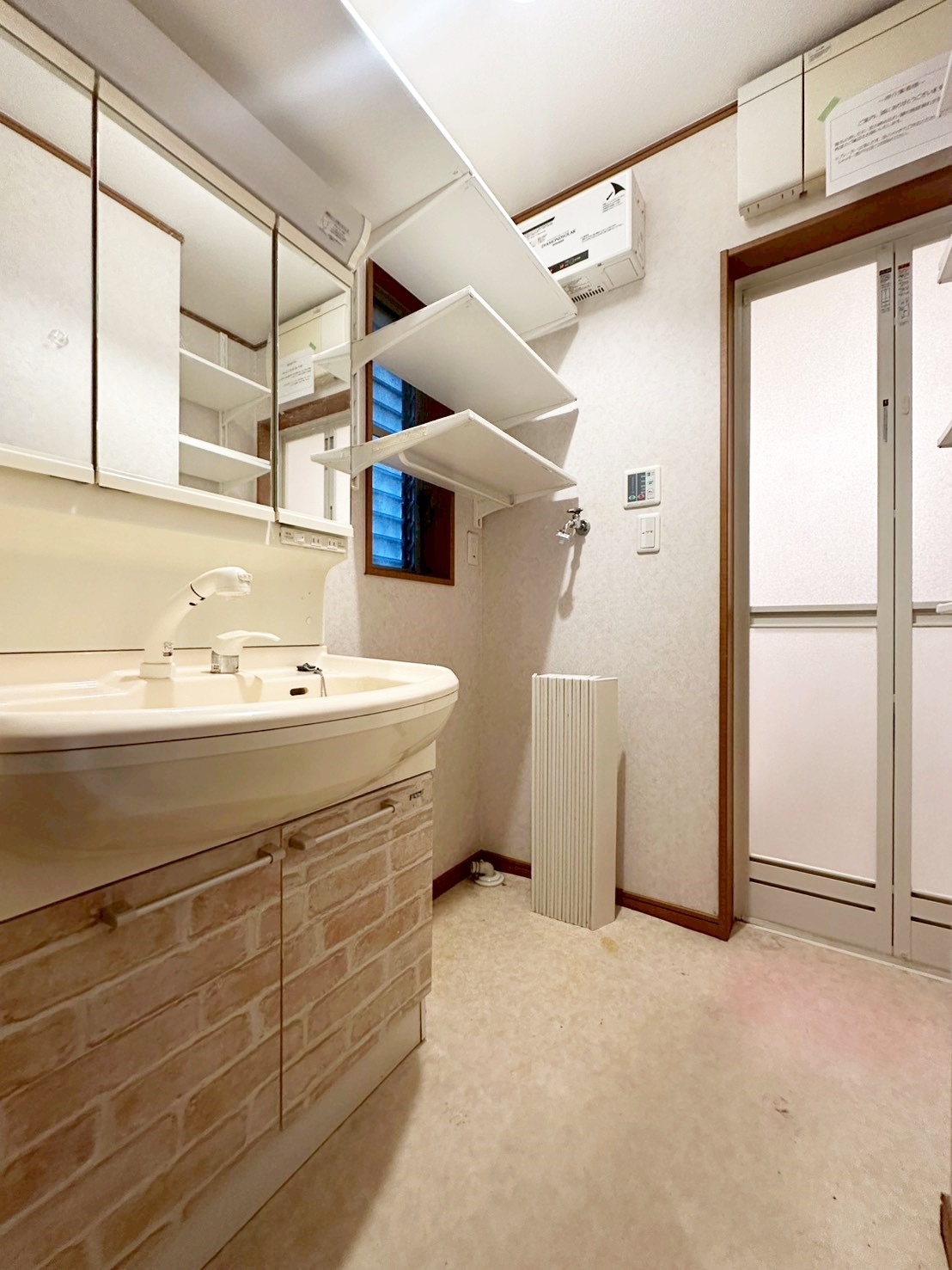 【洗面台・洗面所】洗面台、洗濯機置き場が並ぶ洗面脱衣室。