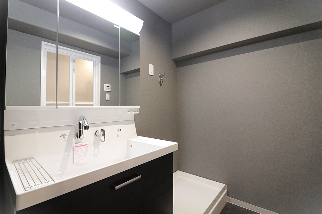 【洗面台・洗面所】洗面室はゆとりある広さで洗面台と洗濯機置き場があります。