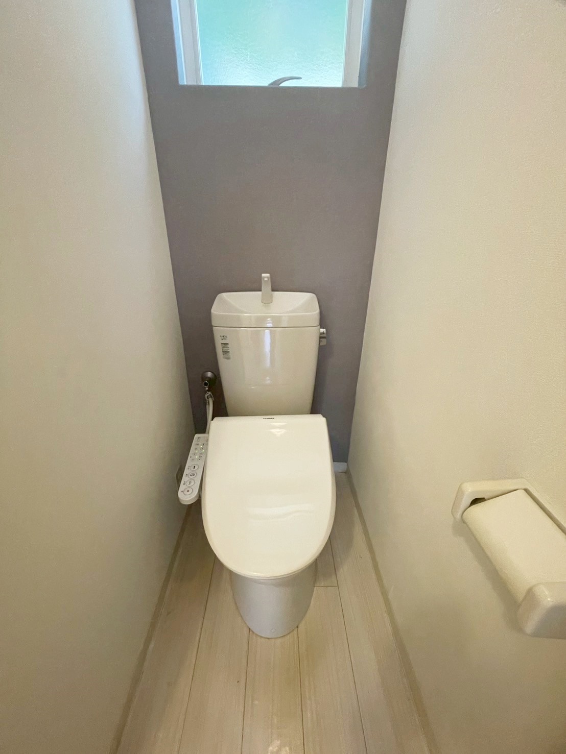 【トイレ】リビングと同様のアクセントクロスでおしゃれな印象に。窓があり自然換気が可能です。